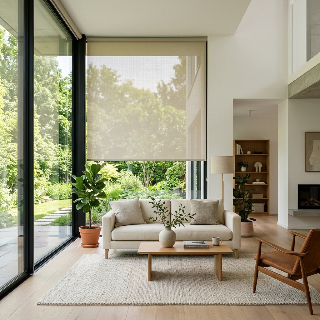 Dışarıyı görmenizi sağlarken güneşin zararlı UV ışınlarını ve parlamayı filtreleyen modern teknik perde.